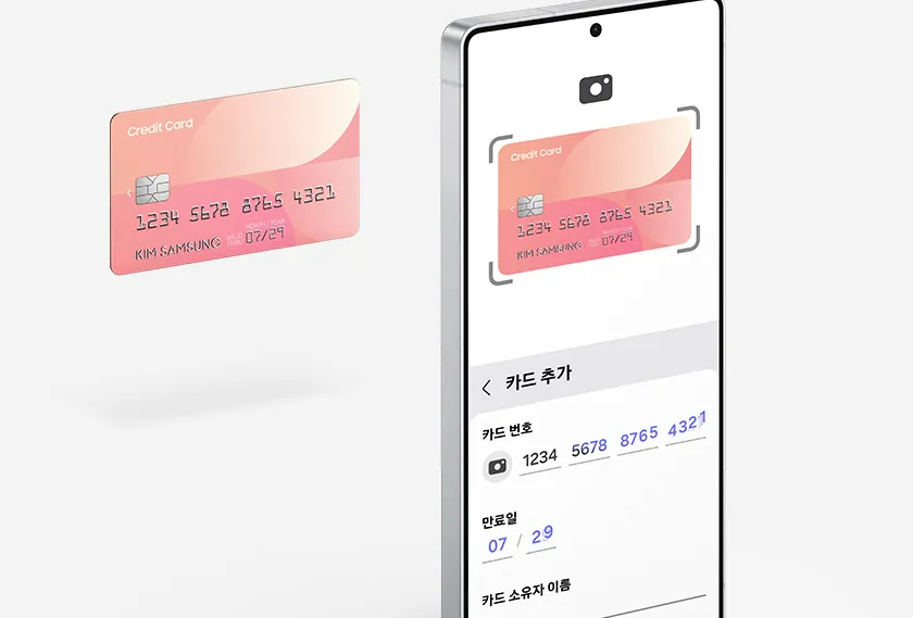 로그인하고 나면 이제 카드 등록을 해야 하는데요, 여기서 삼성페이 사용법이 살짝 헷갈릴 수도 있어요. 카드를 핸드폰 카메라로 찍으라고 하거든요? 그냥 앞면 대고 카메라에 맞추면 자동으로 인식돼요.